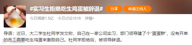 近日,# 实习生拒绝吃生鸡蛋被辞退 #登上微博热搜,引起网友们的热烈讨论。据媒体报道,大二学生杜同学在某公司实习时,部门领导建了一个“蛋蛋群”,没有开单的员工需要吃生鸡蛋来鼓励自己。杜同学拒绝后,被领导辞退开除。