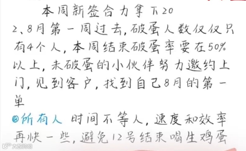 根据杜同学提供的与人事经理录音显示,“生吃鸡蛋”是公司员工手册里注明的,没完成业绩任务除了吃生鸡蛋外,罚钱也不可避免。面对杜同学的质疑,人事经理反问道:“让你吃个鸡蛋违啥法,不然还怎么管理?”