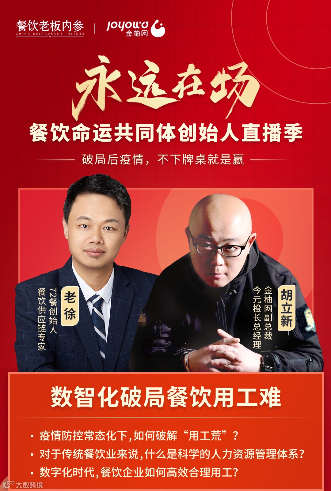 5月23日,金柚网做客餐饮行业知名媒体「餐饮老板内参」直播间。金柚网副总裁、今元橙长总经理胡立新受邀分享“数智化破局餐饮用工难”,和72餐创始人、餐饮供应链专家老徐在线深度对谈,围绕后疫情时代餐企用工痛点,为广大餐企提供数智化用工新思路。