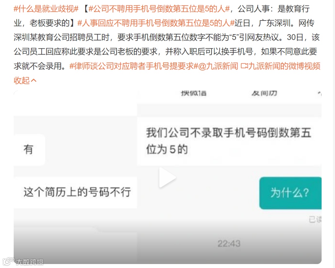“不聘用手机号倒数第五位数字是5的人。”