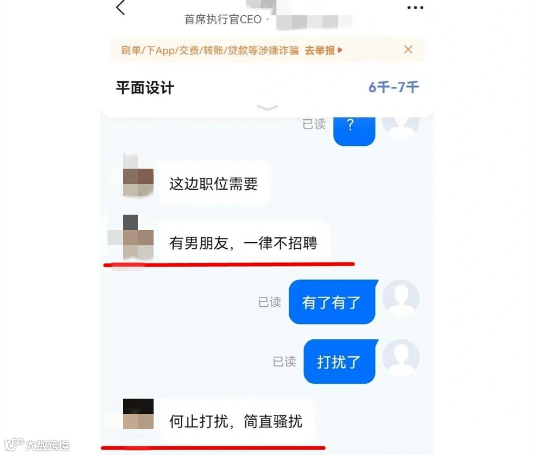 此前,也有网友分享在某平台找工作时,被告知“职位需要,有男朋友一律不招”。拉黑对方后,又收到对方发来“你未约束好自己,已有男朋友,不符合岗位要求”的短信。