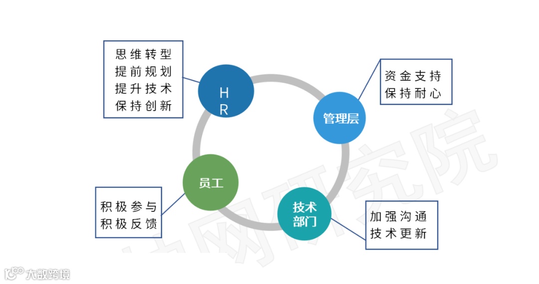 技术部门在转型过程中处于关键地位,要实现人力资源部门提出的需求,同时维护系统、工具的平稳运行。转型过程中需要技术部门与人力资源部门都要有良好的沟通能力,一起努力完成双方的共同目标——实现人力资源数字化成功转型。另外,技术是在不断更新迭代的。技术部门要紧跟时代的潮流,积极学习最新的算法技术,更新数字化系统,让平台更好的为员工服务。