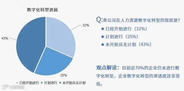 最后,数据安全性问题也是企业比较看重的问题,如果选择自行开发系统,成本过高。如果外购系统平台,这意味着企业的相关数据都将会上传到云平台中,内部数据安全性凸显,有些企业的决策者甚至因此而放弃人力资源数字化的转型。而面对转型后大量的数据,深度分析才能显示出其真正的价值。然而大多数HR并不具备深度数据分析能力,无法体现出数字化转型后数据的价值。