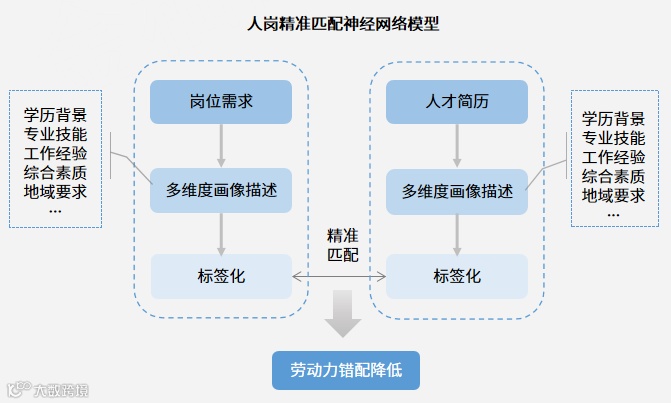 人力资源数字化通过数据算法和人工智能深度学习构建企业人才库,将人才简历进行多维度(学历、专业技能、工作经验等)识别解析,得出人才数据画像并将人才进行标签化分类。平台再通过领先的神经网络模型将企业需求与人才简历进行精准匹配。人力资源数字化可以消除资源自由流动中存在的诸多阻碍,进一步提高资源的配置效率,从而降低甚至是消除资源错配。