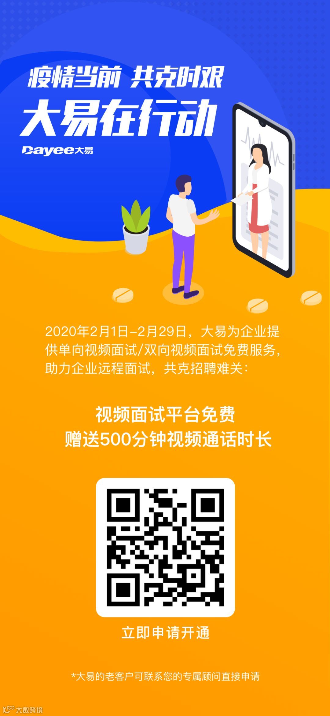 2020年2月1日-2月29日,大易为企业提供远程(双向/单向)视频面试免费服务,并赠送500分钟视频通话时长,两种视频形式适合不同场景的需求,助力企业轻松完成远程面试。