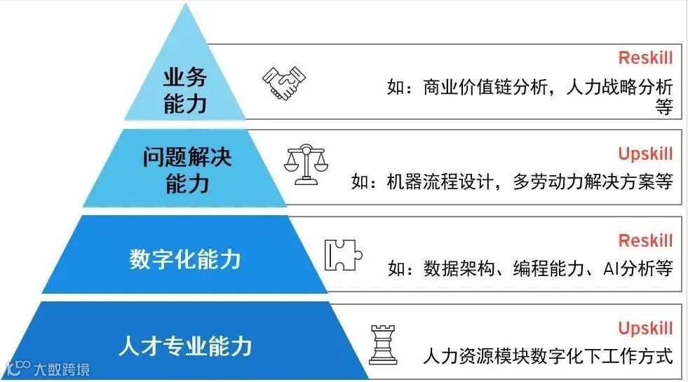 人力资源模式的重塑(新三支柱模式)也对人员的能力提出了新的要求。为实现人力资源新角色,人力团队需拥有4层能力模型:人才专业能力及问题解决能力已有基础,需技能升级;业务能力及数字化能力与原有技能相差较大,需技能转型。