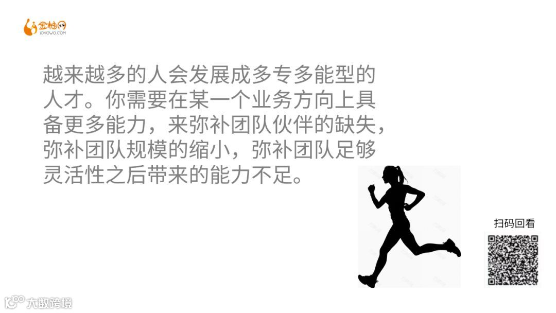 进入云办公时代,人才越来越不需要组织,工作环境、工作平台都在发生更大的变化,越来越多的人会发展成多专多能型的人才。你需要在某一个业务方向上具备更多能力,来弥补团队伙伴的缺失,弥补团队规模的缩小,弥补团队足够灵活性之后带来的能力不足。