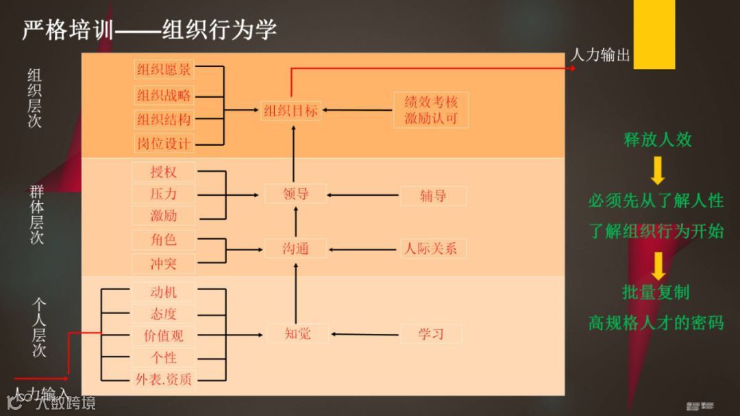 我还是用店长的岗位来说明,把它认为是一个人的加工厂,一个企业快速发展,它需要培训非常多的店长,那么店长就是一个你要去设计的最核心和最基础的岗位。假设店长的岗位设计好了,开始找人来进行培训。我们可以想象一下左下角就是人力的输入,右上角是人力的输出,中间分三层的结构, 这就是冰山模型的内容。一层结构,也就是个人层次,包含外表、个性、价值、观态度和动机, 是往上,越存在潜隐藏性的特点,也比较难以去培养。相对来讲,个性资质和价值观相对容易一些。