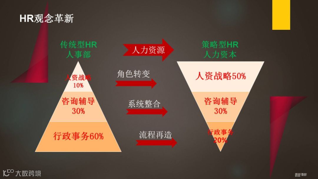 谈到转型,首先要确定自己目前的角色定位。如果你的行政工作超过50%,还是处在一个非常传统的HR的角色上;行政工作超过70%,其实你是很危险的hr,因为你没有发挥出一个HR应该要有的价值。如果你的战略性工作超过50%,甚至更高的话,那么你正处在一个能够发挥你真正价值的舞台上。