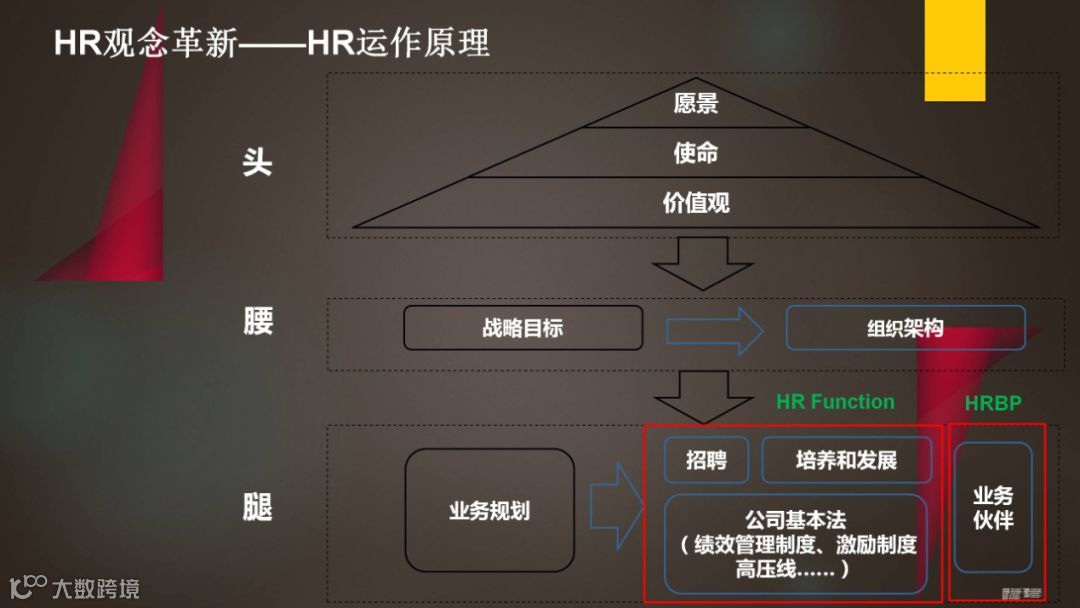 这张图只要是我谈到HR业务的时候,HR跟业务部门沟通业务的时候,这张图我一定会谈到,它分为头、腰、腿三个结构,阿里前人才发展专家张俊丽小姐也曾谈过这三层结构的逻辑。所谓头,就是我们必须要从愿景使命价值观来出发;所谓腰,是要帮助老板根据他的战略目标去制定相对应匹配的组织结构,这也是最重要的部分。如果作为HR并没有参与到公司的组织结构设计,那么你可能还没有真正碰触到公司最核心的业务。 真的做好一个HR,整个组织设计一定是HR工作的最起点。