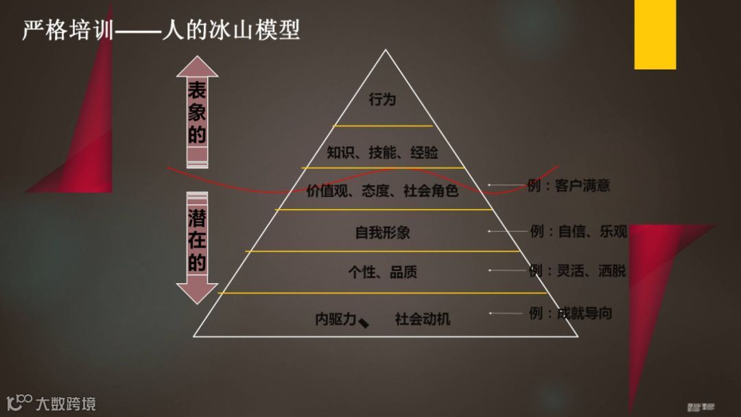 假设这是一座冰山的话,红色以上是露在水面上的那一块,真正只有1/10会露在水面上,有9/10的部分都是露在水面以下,所以一个是表象的,一个是潜力的。分享一个我们公司在岗位设计跟选材的模型给大家看一下,我尽可能用一个比较简单易理解的模型结构做说明。