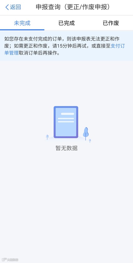 进入【更正申报与作废申报】页面之后可以看到包括未完成、已完成、已作废在内的所有申报记录。选中已完成的一条申报记录即可进行更正或作废。
