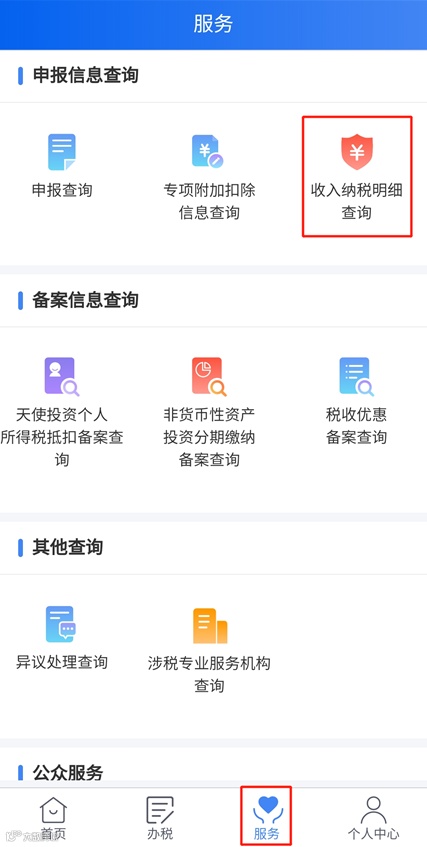 点击首页下端的【服务】—【收入纳税明细查询】,查看自己的综合所得收入纳税明细。