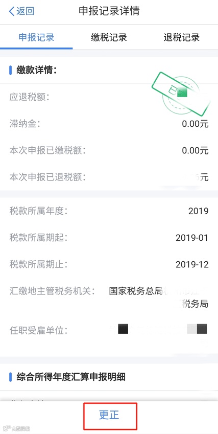 第一步:点击“申报记录详情”页面右下方的【更正】,选择【更正年度自行申报】;