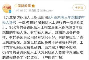 中国青年报社会调查中心联合问卷网,对1984名职场人士进行的一项调查显示,90%的受访职场人指出周围入职未满3年就跳槽的年轻人多。