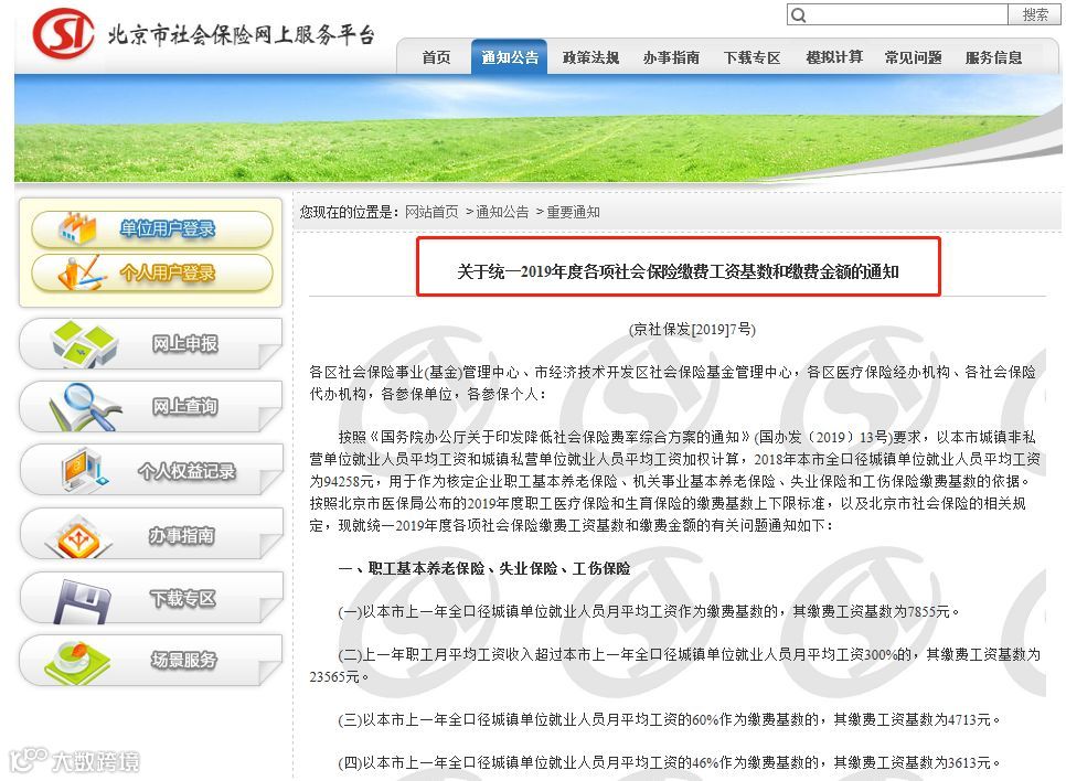 7月4日,北京市社保中心发布《关于统一2019年度各项社会保险缴费工资基数和缴费金额的通知》。