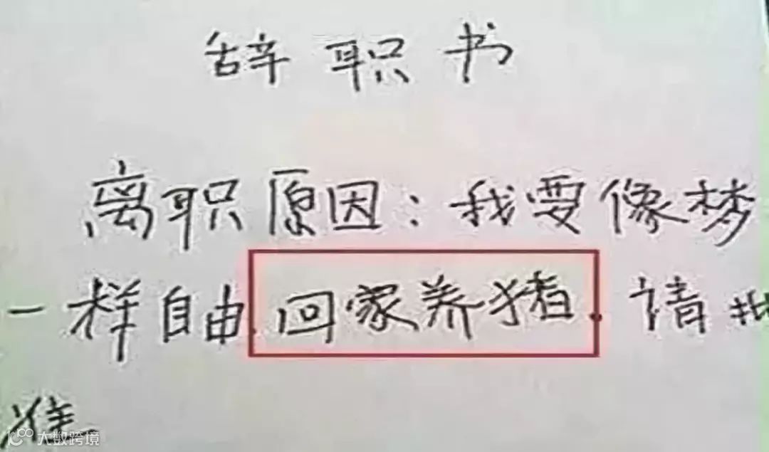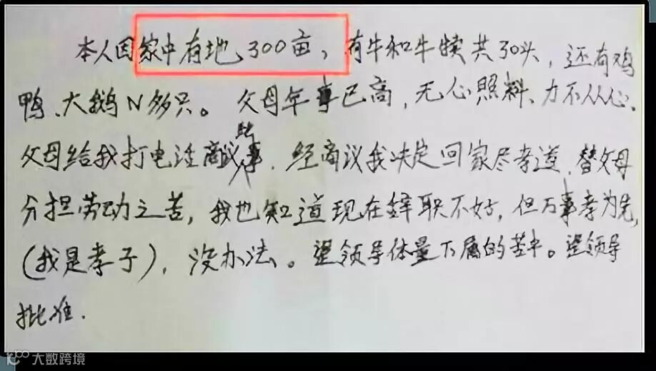 辞职理由:家里有地300亩,鸡鸭牛鹅数十只等着我回去打理,最主要的是父母年事已高,需要有人照料。