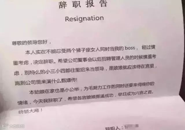 辞职理由:不能忍受两个狮子座女人同时当我的boss,经过慎重考虑,决定辞职。