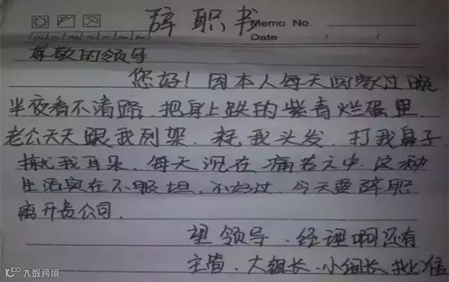 辞职理由:夜班回家总看不见路,每次都跌个狗吃屎!天天和老公吵架,还打我!