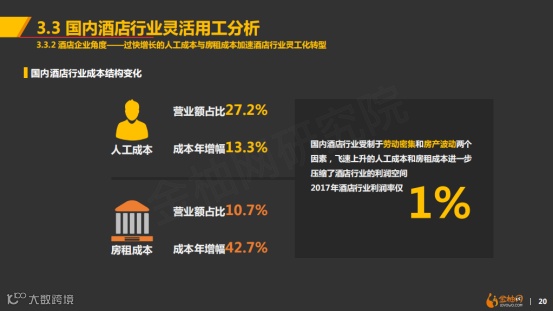 根据金柚网研究院发布的《2019中国灵活用工及灵活就业研究报告》显示,国内酒店行业受制于劳动密集和房产波动两个因素,仅人工成本一项在酒店营业额占比中就高达27.2%,年增幅13.3%。飞速上升的人工成本进一步压缩了酒店行业的利润空间,2017年酒店行业的利润率仅为1%。