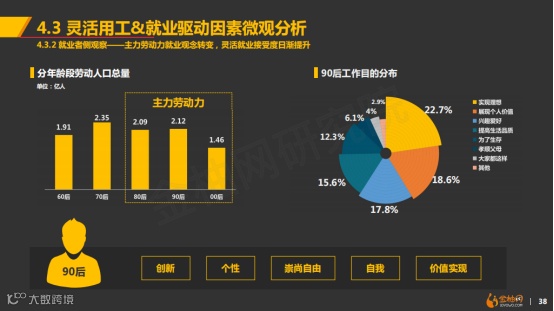 第四,《2019中国灵活用工及灵活就业研究报告》数据显示,我国90后群体劳动力数量规模高达2.12亿,为主要劳动力。不同于以往“铁饭碗”“终身制”的就业观念,越来越多的年轻群体倾向于选择更为自由、灵活的新型就业方式。