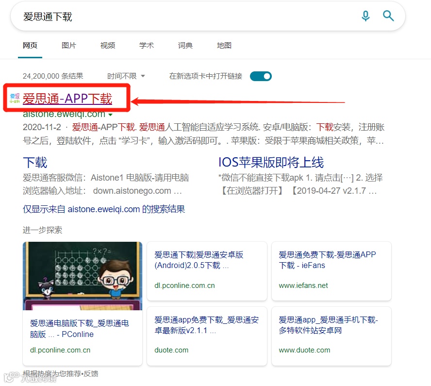 首先,我们需要打开百度/浏览器,输入“爱思通下载”搜索(或者直接输入爱思通下载网址down.aistonego.com)。