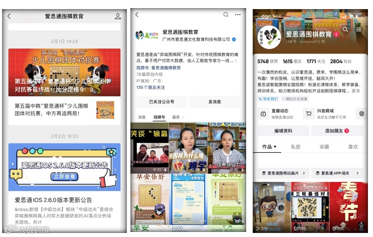 爱思通搭建“公众号、视频号、抖音、微信社群”等新媒体渠道,向社会各界及同行们传播围棋文化知识,进行围棋教育价值输出。