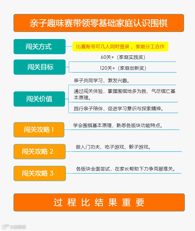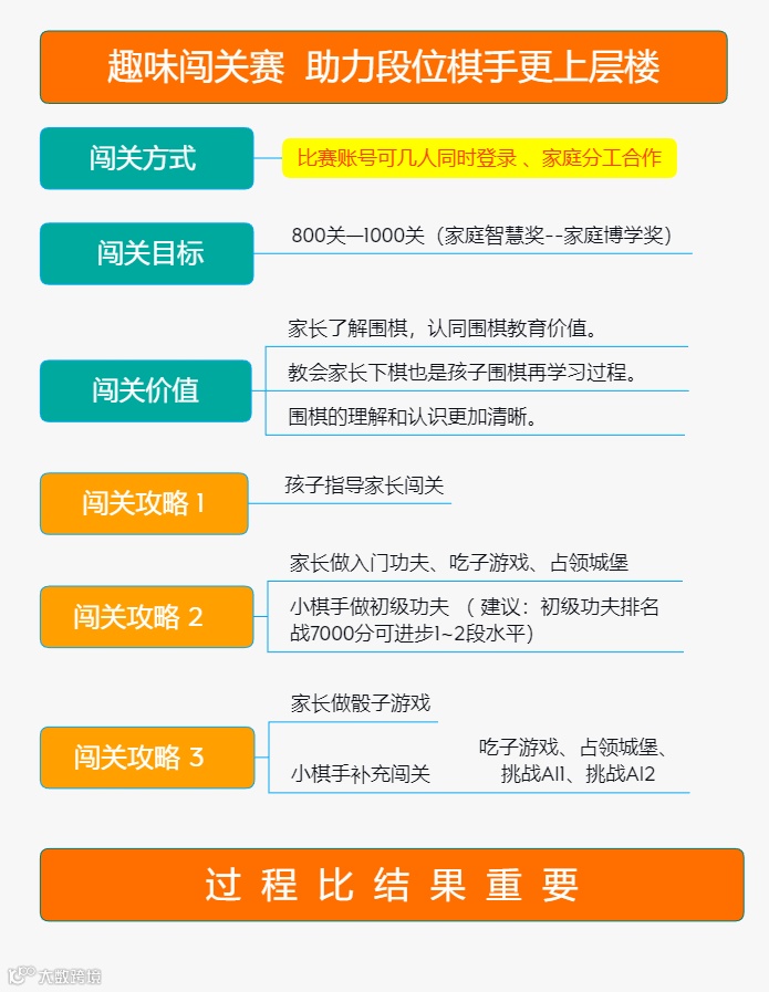 对于启蒙、初级阶段的小棋手,此次闯关赛不仅是一次巩固认知、多元成长的机会,更是一次通过“教”家长闯关,把自己对围棋的理解通过“对外传递”这样的特殊渠道进行信息整合、认知思索的绝佳机会。在不断的知识“输出”过程中,孩子对于围棋的理解能够越发清晰,很多过去被忽视的知识点,也能够在家长的学习反馈中得到孩子更多的重视与消化。