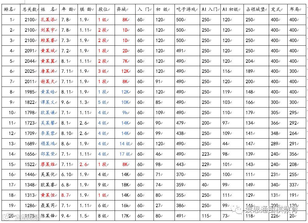 四、棋龄与棋力之间没有绝对的对应关系。闯关数排在十五位的廖某维,在弈城棋力(8K)与段位(1段)方面,与闯关数超过2000的学员的相比,没有任何优势,但是棋龄已经达到两年六个月。其他几位两年六个月棋龄的学员棋力方面就更低一些。这些学员因为是后来转入爱思通实验班的,造成闯关数据方面还不够理想,棋龄与闯关数据相比,很明显闯关数据对孩子棋力水平影响更大。