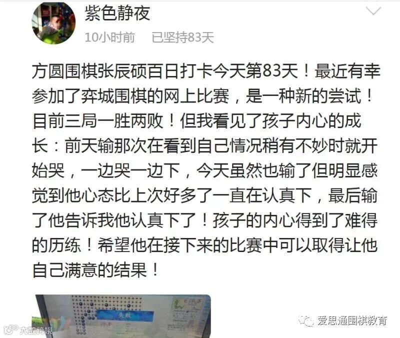 正在举行的“爱思通”杯全国少儿围棋交流赛已经进入到第三轮阶段,来自安徽阜阳方圆围棋半年棋龄的张辰硕小朋友,抱着特别想赢的心态参加了此次比赛,但三局战罢,仅仅一胜两负,从结果来说差强人意。然而,就在输掉的两盘棋里,张辰硕宝妈看到了围棋学习的价值。