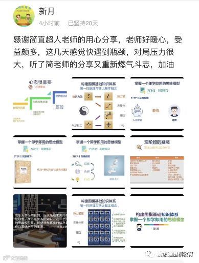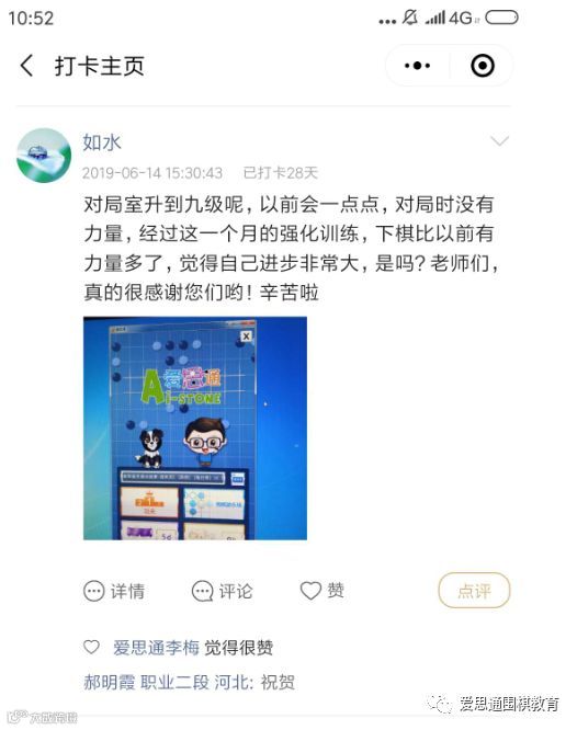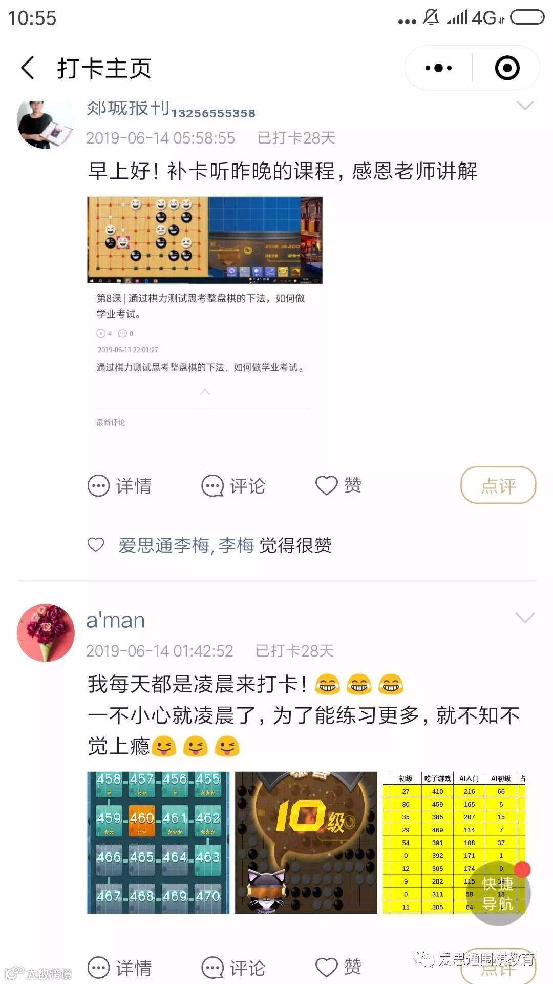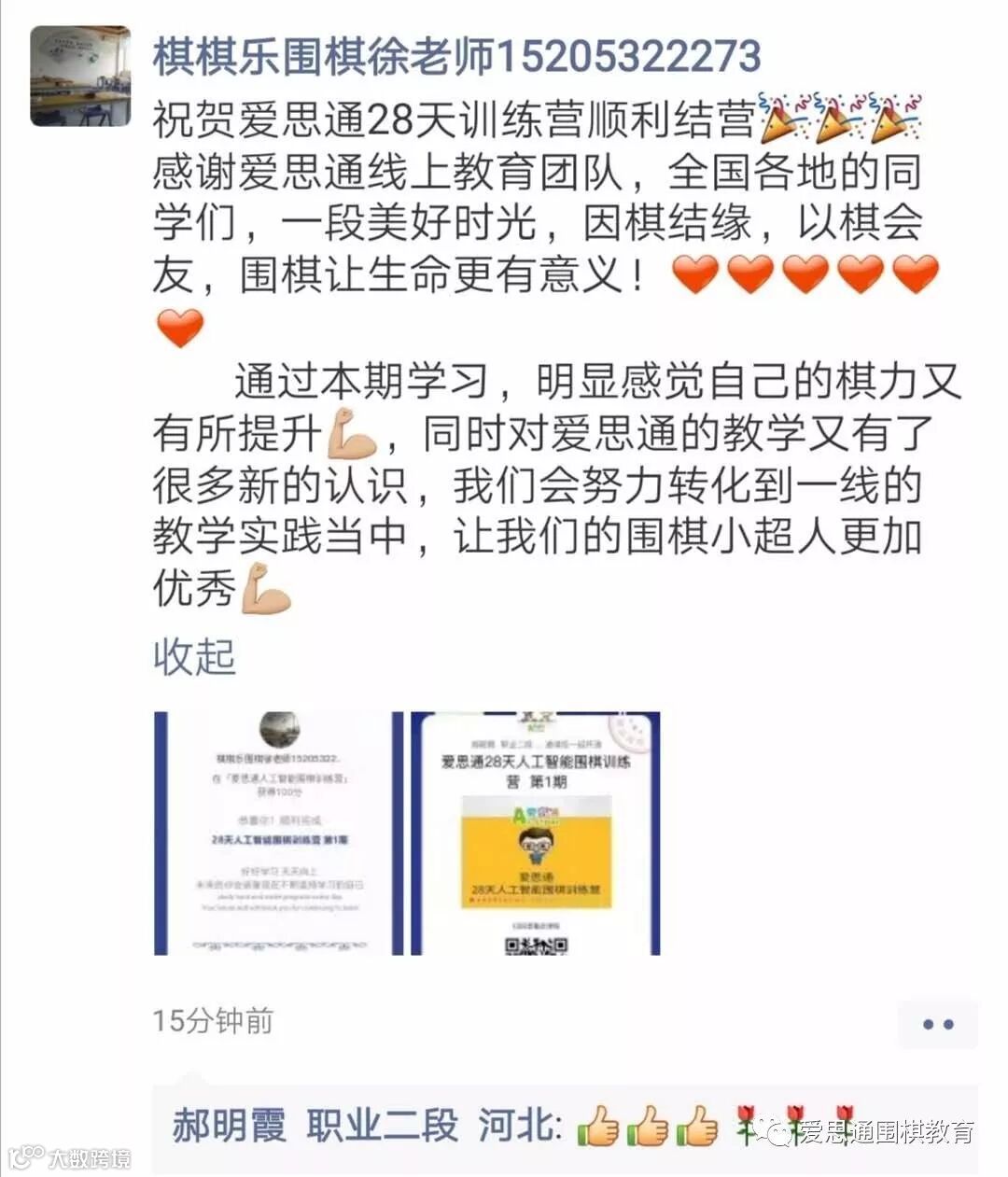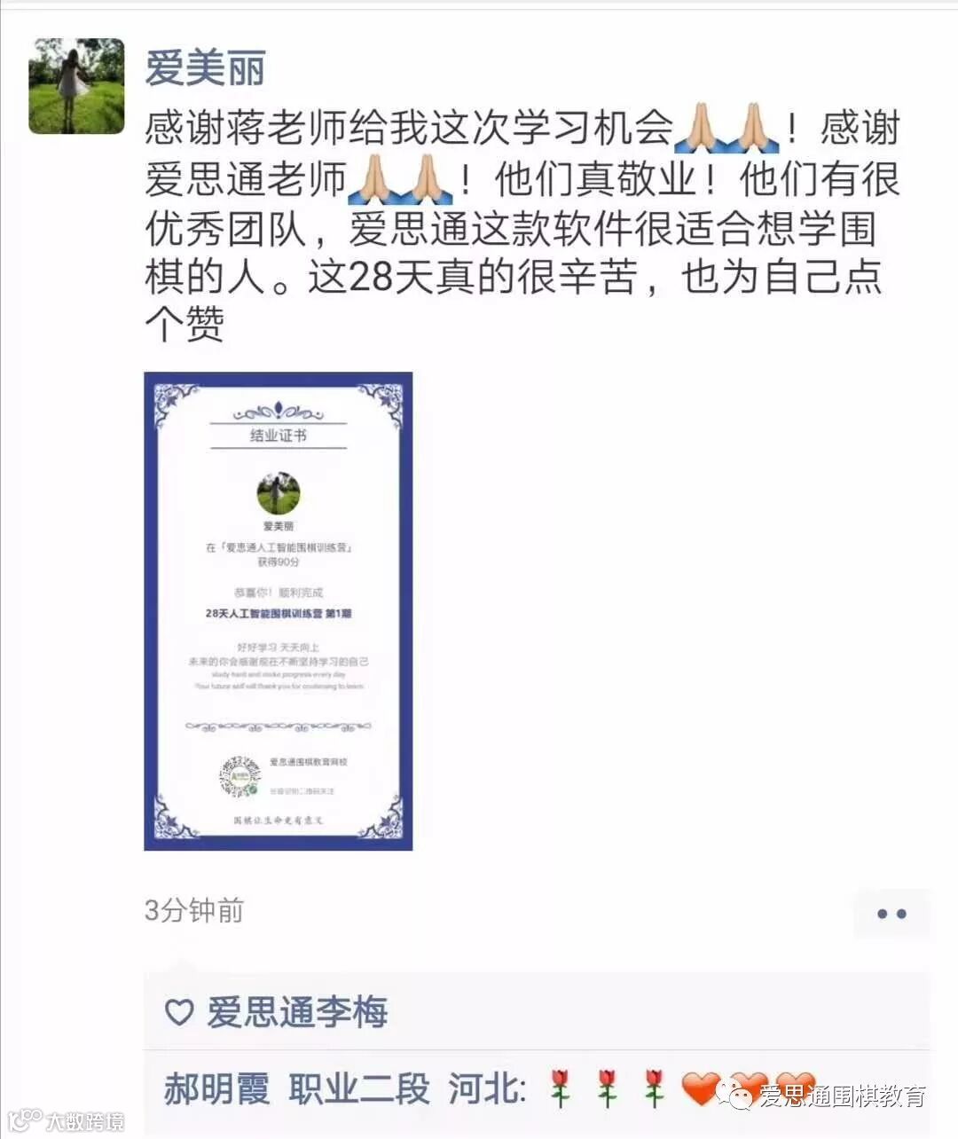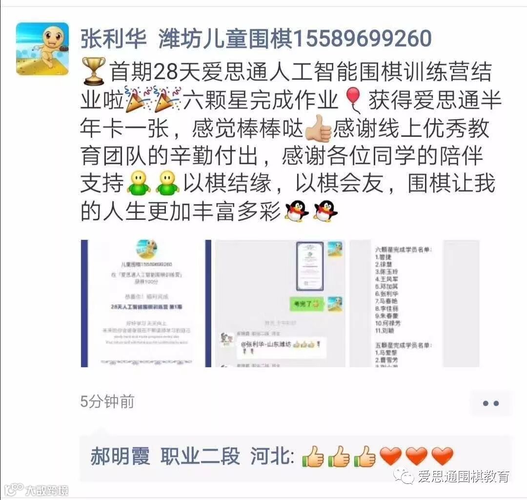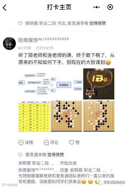 各位训练营的学员,学习期间也不忘坚持打卡,记录每天学习的点滴,分享进步与成长。天道酬勤,按时听课与完成课后任务的学员,不仅棋力得到了大幅提高,更加深刻了解了爱思通及其教育理念,并将爱思通的学习方式继续在全国普及,让更多小朋友接触爱思通,以轻松高效的方式学习围棋。