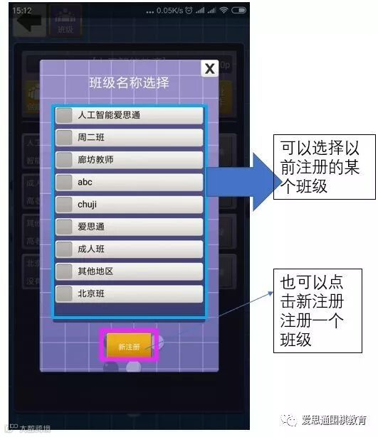 点击创建班级里第一个方框:班级名称,可以选择一个班级。如果以前注册的班级没有自己需要班级,可以点击新注册,注册一个班级。