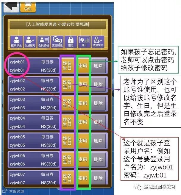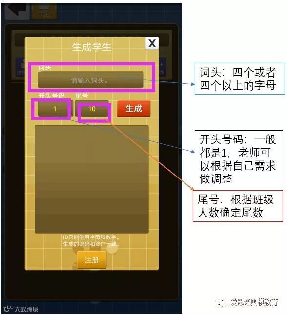 演示:我们输入“zyjwb”周一级位班的首字母,确定后点红色的生成,再点击下方的注册。这样我们班级的孩子账号就生成了。