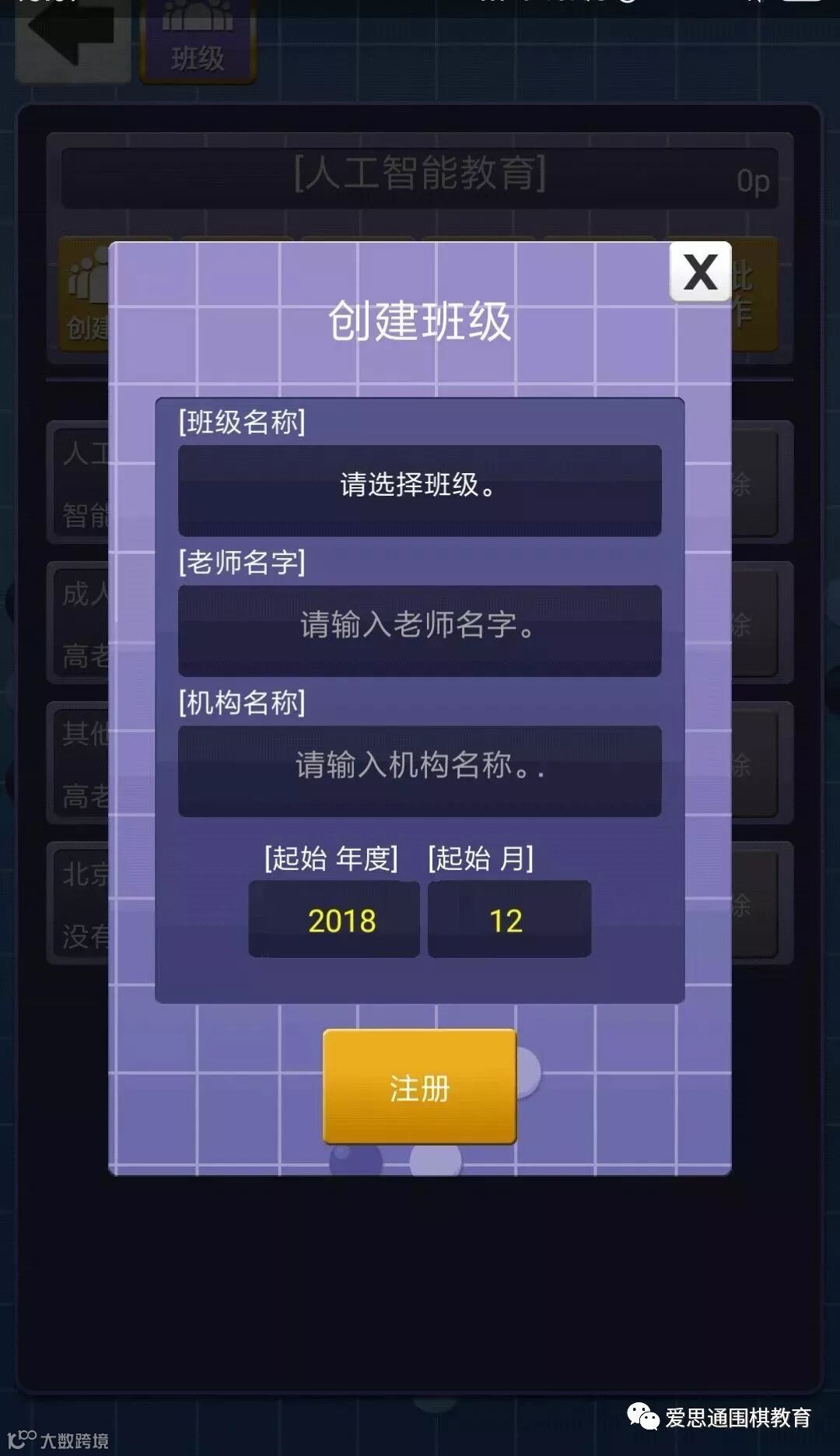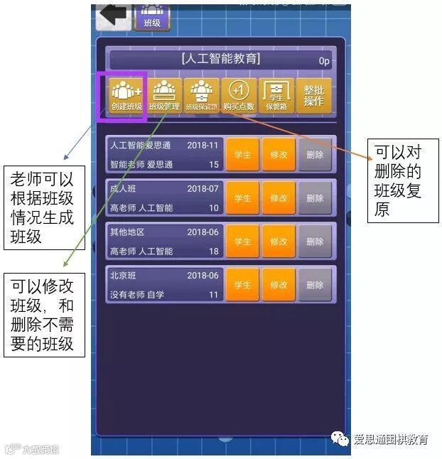 演示:我们填完班级名称(人工智能爱思通)、老师名字(小爱老师)、机构名称(爱思通),点击注册,这样我们班级就生成完毕。然后出现如下界面。
