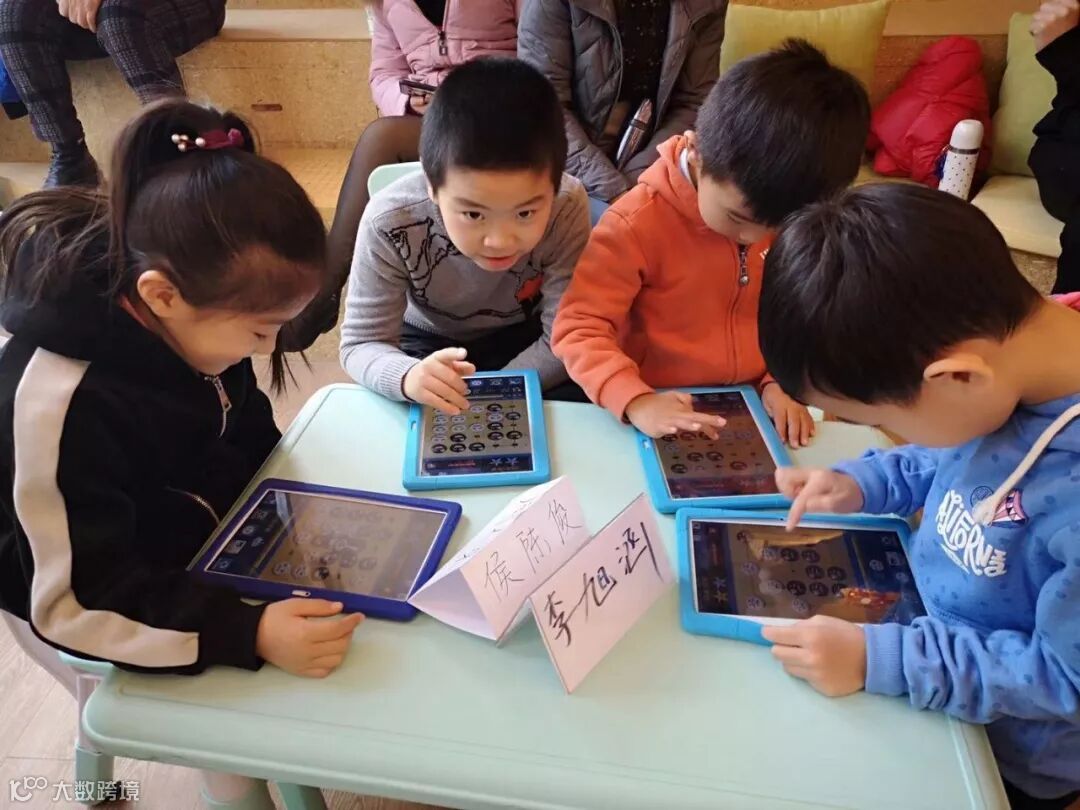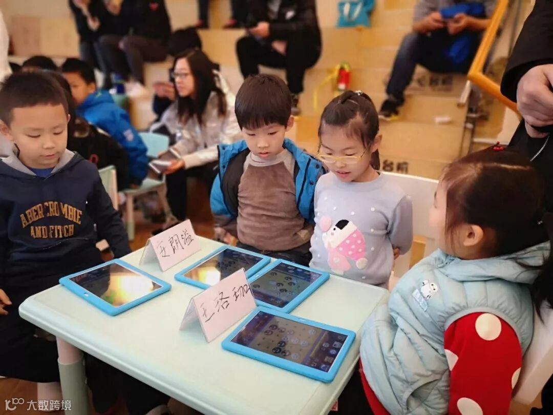 如果说第一个环节考验的是小朋友的个人实力与发挥,那么第二个环节的队际赛,则是一个全方位的考验:有棋力上的测试,还有全局观念,团队配合等。小朋友们4人一组,分成6组进行PK。组成一个队的小朋友,通过在真实的9路棋盘上研讨,决定招法后点在旁边的平板上,孩子间对局的进程会同步联动到老师的大屏幕上。每个队的小朋友必须团结一致,寻找最优下法,形成大带小,高带低之势,集体讨论,共同面对,气氛热火朝天。