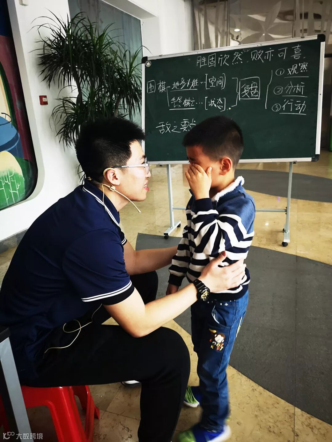 12位孩子,四个小组(3人为一组)分为黑棋、白棋两队进行比赛。孩子们不但需要一起分析棋盘上的形势,而且还要考虑同队以及对方行棋的目的,商量对策进行应对,无疑是一场欢乐的头脑风暴!
