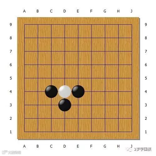 现在,三个黑子围住了一个白子,白棋只剩下一条路,如果黑棋在坐标5D处,再摆上一个黑子,白棋就彻底围死,就要被拿出棋盘了。