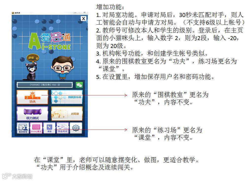 4. 原来的围棋教室更名为“功夫”,练习场更名为“课堂”。