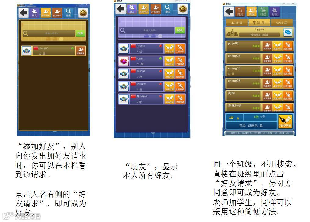 \u000b1. 对局室功能。申请对局后,30秒未匹配对手,则人工智能会自动与申请方对局。(不支持6级以上帐号)