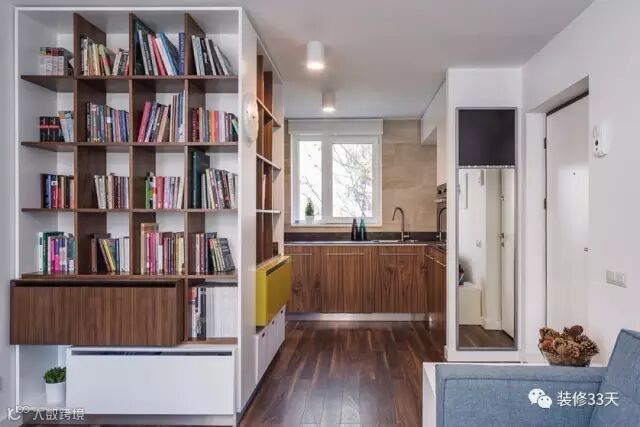 ▲ 进门的这个位置,三面都利用起来设计了柜子,靠客厅这边是格子书柜