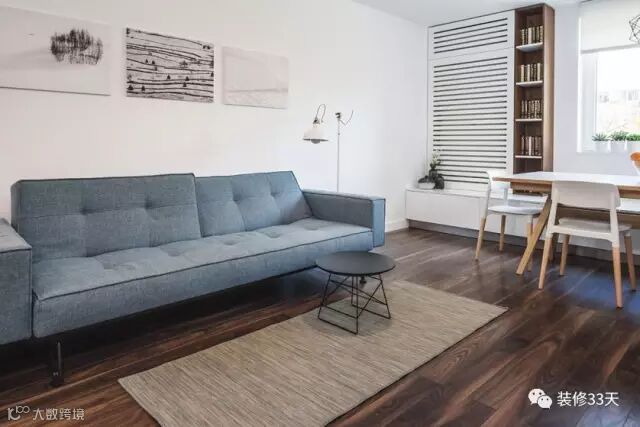 ▲ 蓝灰色的布艺沙发,因为空间小搭配了非常小的一个茶几,否则会显得过于拥挤