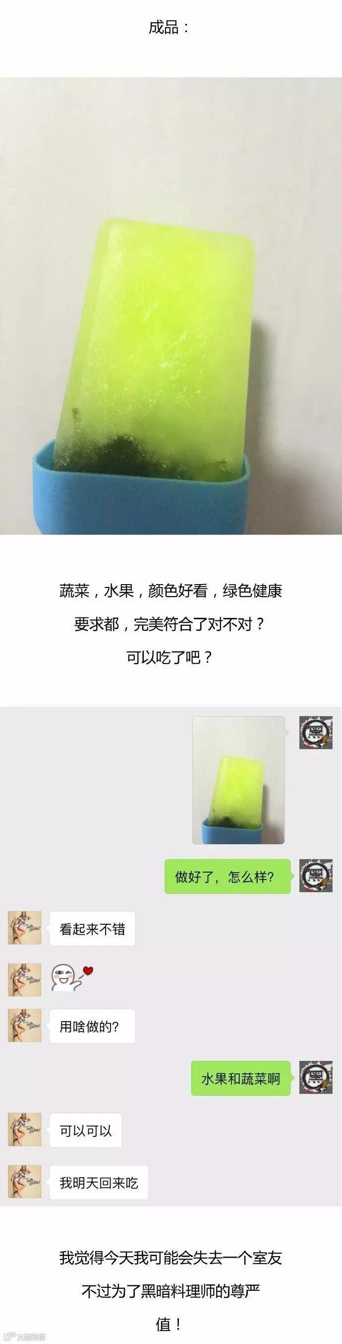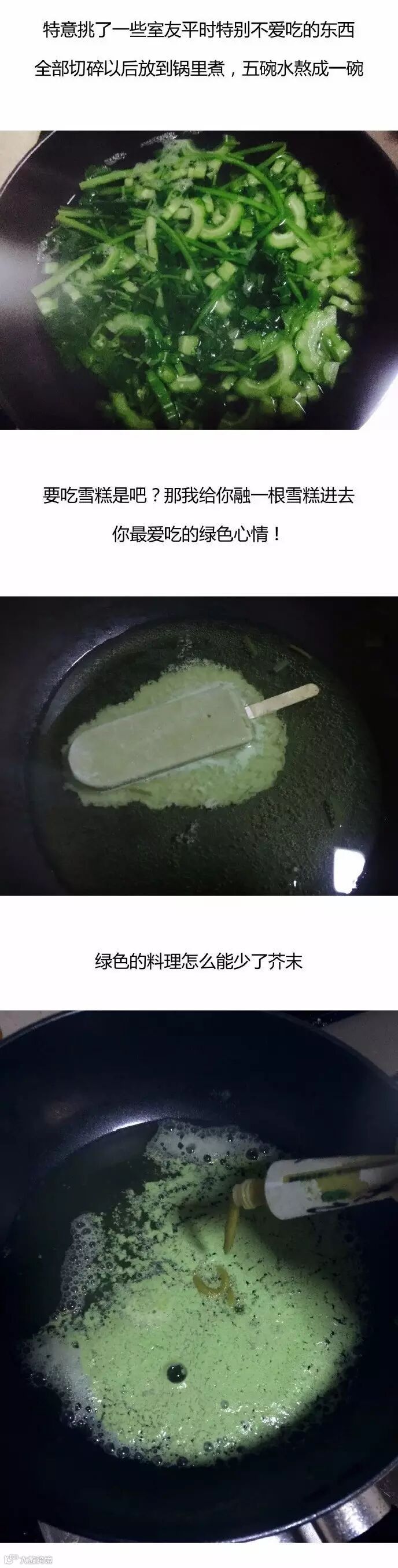 看完只想发自肺腑地说一句:你神经病啊!!!上辈子造了什么孽能遇到这么优秀的室友啊!不过港真,冷哥还蛮想试一下的,这些黑暗料理的卖相竟然有点不错......