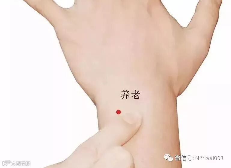 要找准养老穴,手背朝上,以此状态观察手腕的小指侧,可以肉眼看出骨骼突出部分。