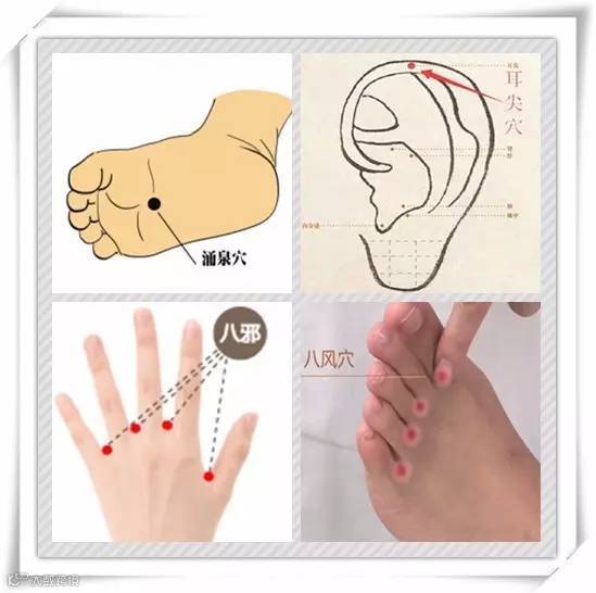 6、清热解毒穴:耳尖、八邪、八风、涌泉穴