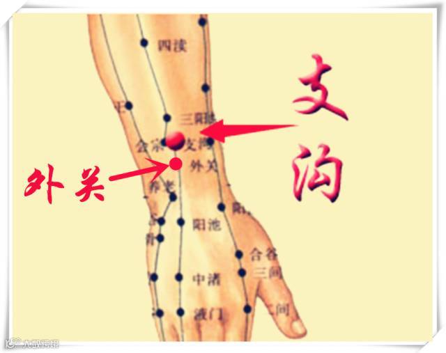 支沟:位于前臂背侧,当阳池与肘尖的连线上,腕背横纹上3寸,尺骨与桡骨之间。