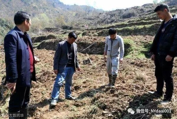 图:当地镇党委书记邓杰、镇长谭见和镇产业办主任朱胜东现场指导艾苗栽种工作。