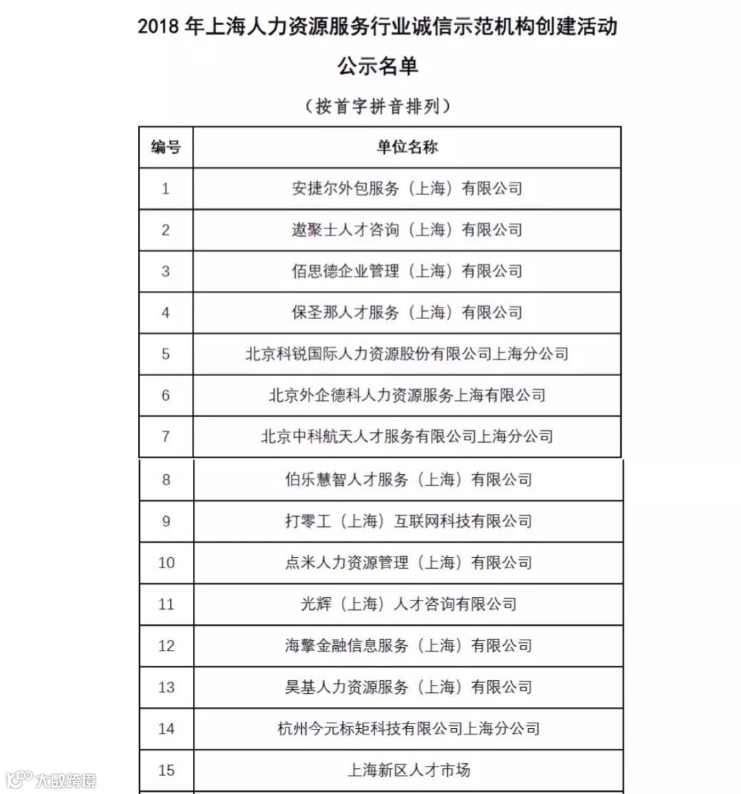 为加强上海人力资源服务行业诚信体系建设,提高人力资源服务机构服务质量,鼓励和倡导人力资源服务机构积极、规范、健康地发展,上海人才服务行业协会于2019年1月-3月组织开展“2018上海人力资源服务行业诚信示范机构创建活动”,通过协会对申报材料初审以及专家委员会复审,最终共有153家企业入选。