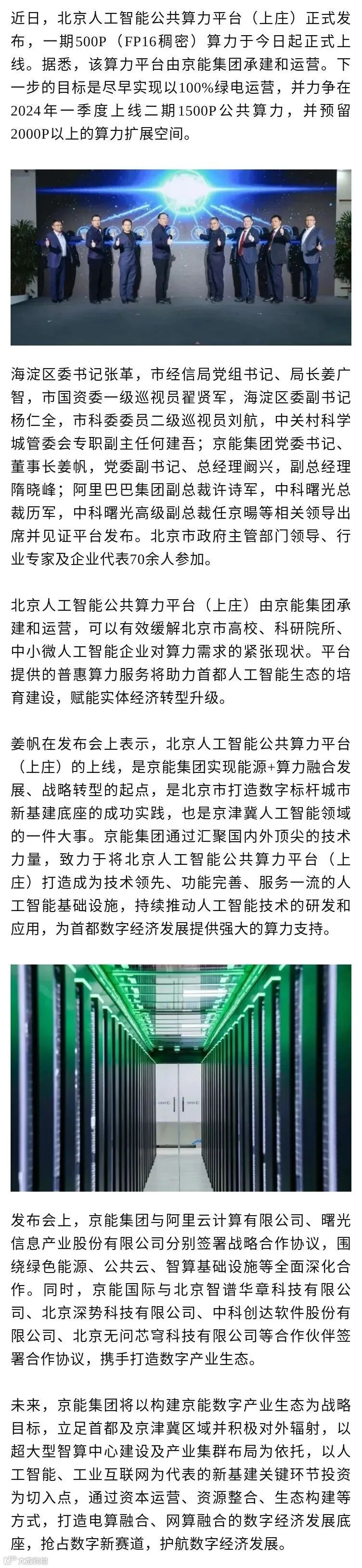 北京人工智能公共算力平台(上庄)正式发布,一期500P(FP16稠密)算力于今日起正式上线,该算力平台由京能集团承建和运营。下一步的目标是尽早实现以100%绿电运营。