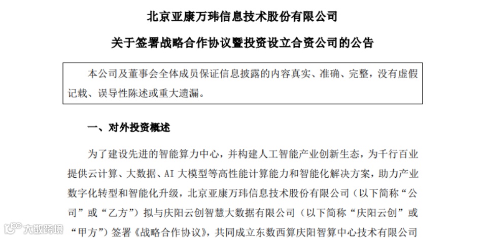 亚康股份拟与庆阳云创智慧大数据有限公司(简称“庆阳云创”)签署《战略合作协议》,共同成立东数西算庆阳智算中心技术有限公司,该合资公司注册资本为3亿元。