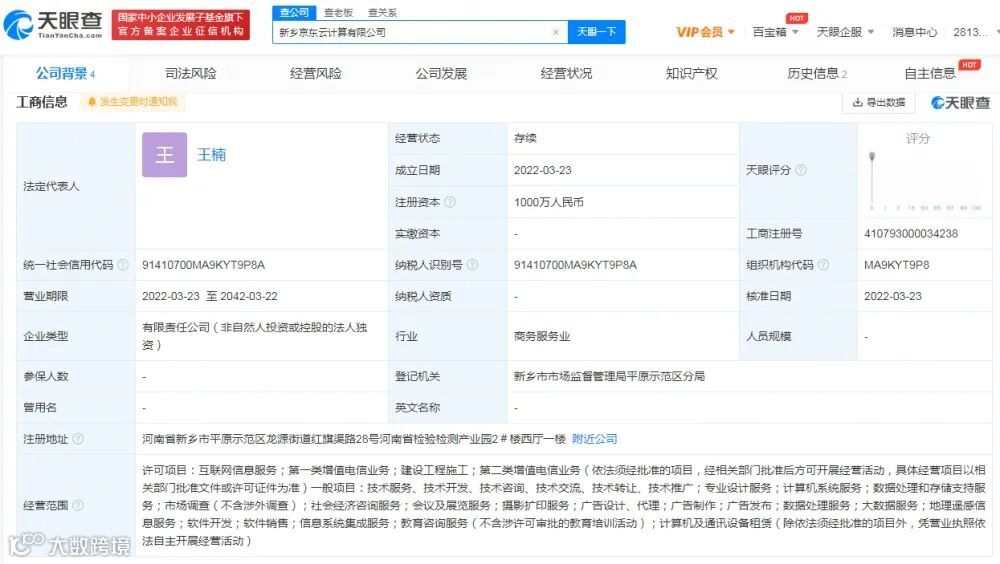 新乡京东云计算有限公司成立,法定代表人为王楠,注册资本1000万人民币。